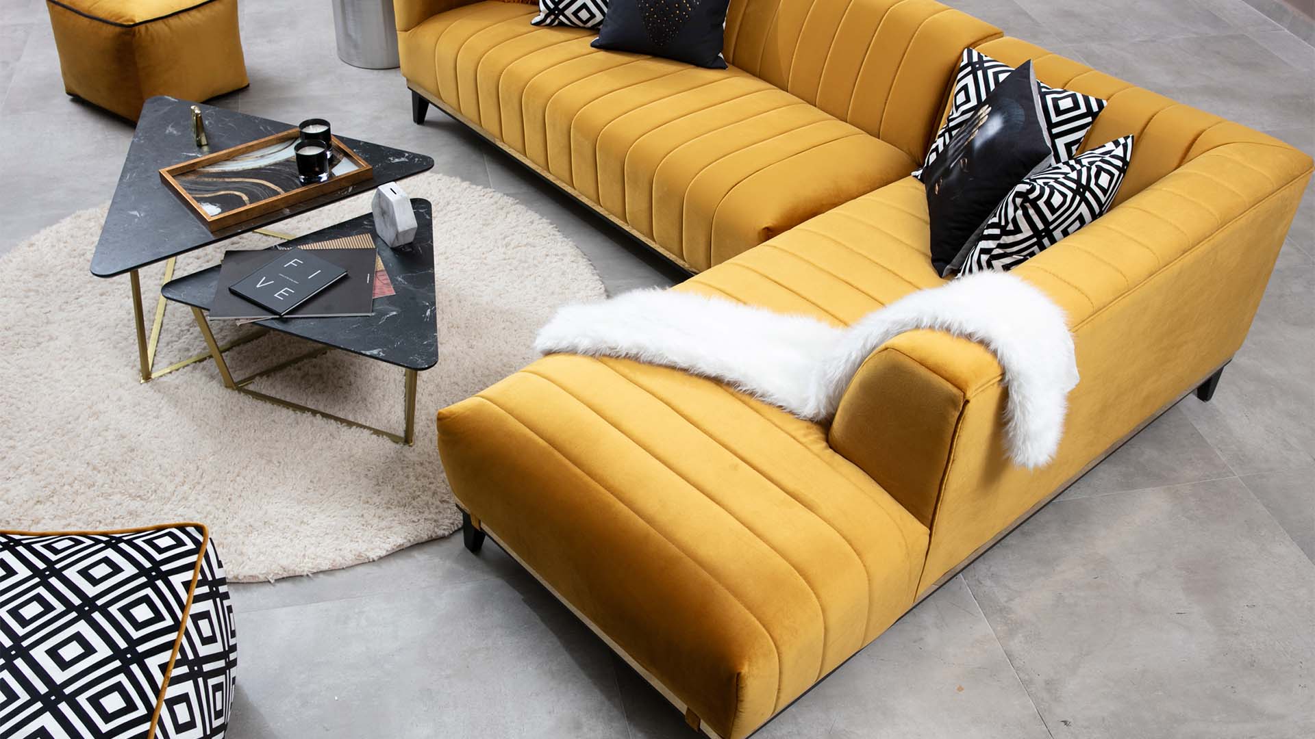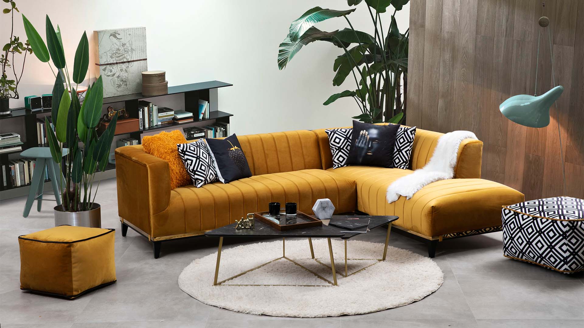 Oturma yerlerinde bulunan çizgili dikiş detayları tasarıma hareket katmıştır. Bellino Klasik Köşe Takımı sarı rengin enerjisinden ilham alınarak tasarlanmıştır. Farklı desenli pufu aynı desendeki kırlentler ile uyum içerisindedir. Güne enerjik başlamak için Bellino ile tanışın.